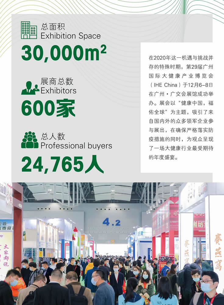 在2020年這一機遇與挑戰(zhàn)并存的特殊時期,第29屆廣州國際大健康產(chǎn)業(yè)博覽會(IHE China)于12月6-8日在廣州·廣交會展館成功舉辦。展會以“健康中國,福佑全球”為主題,吸引了來自國內(nèi)外眾多領(lǐng)軍企業(yè)參與展出,在確保嚴格落實防疫措施的同時,為觀眾呈現(xiàn)了一場大健康行業(yè)最受期待的年度盛宴。