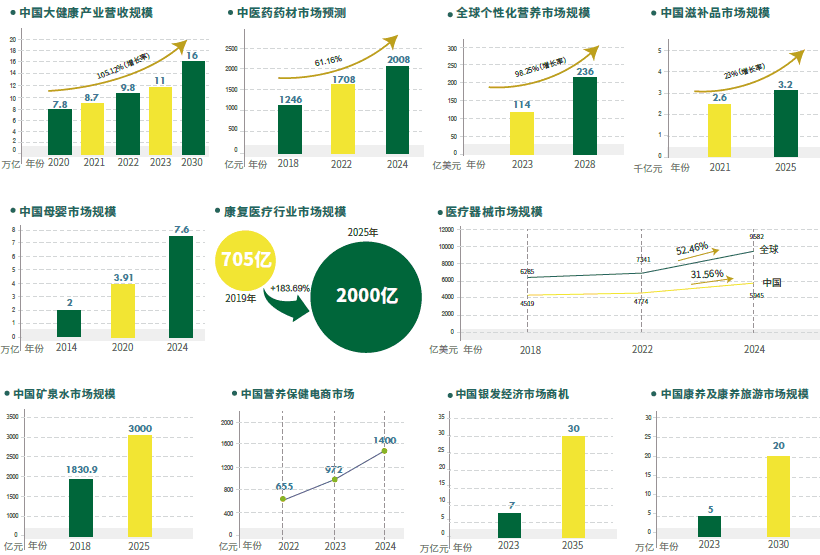 我國大健康產業(yè)正迎來顛覆性的發(fā)展與機遇。2023年我國大健康產業(yè)市場規(guī)模約為11萬億元,預計此數(shù)據(jù)到2030年將達到16萬億元。